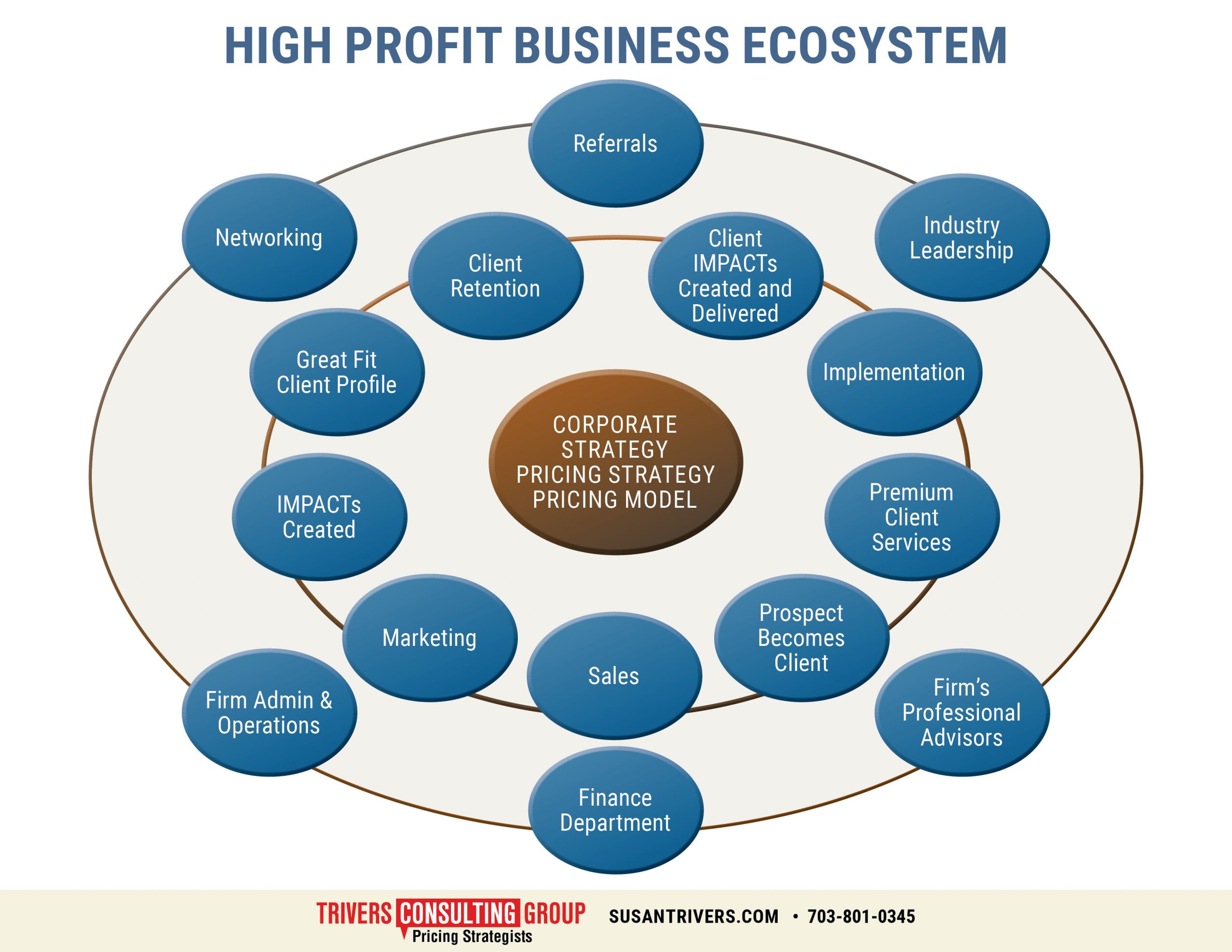IMPACT PLUS: The Health check audits the company’s outer circle, including networking and referrals, and internal support functions such as finance and admin. The IMPACT audit is included. (Nucleus and inner and circle.)